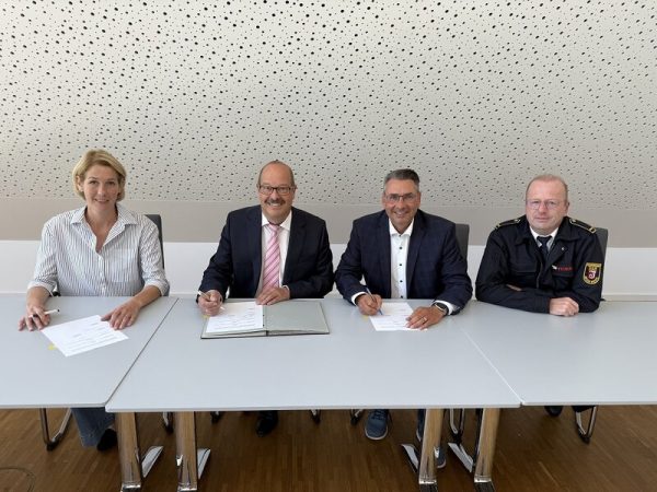 Die Vereinbarung unterzeichnete Bürgermeisterin Katrin Reuscher (Sendenhorst) mit ihren Amtskollegen (v.l.) Carsten Grawunder (Drensteinfurt) und Dr. Alexander Berger (Ahlen). Rechts Michael Witkenkamp, stellv. Feuerwehrchef Ahlen. – Foto: Stadt Ahlen