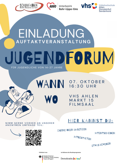Im Rahmen der neuen Förderperiode des Bundesprogramms „Demokratie leben!“ startet das Jugendforum in Ahlen mit frischen Impulsen und neuen Strukturen in die nächste Phase. Ziel ist es, Jugendlichen und jungen Erwachsenen mehr Beteiligungsmöglichkeiten zu geben und Raum für Engagement zu schaffen.