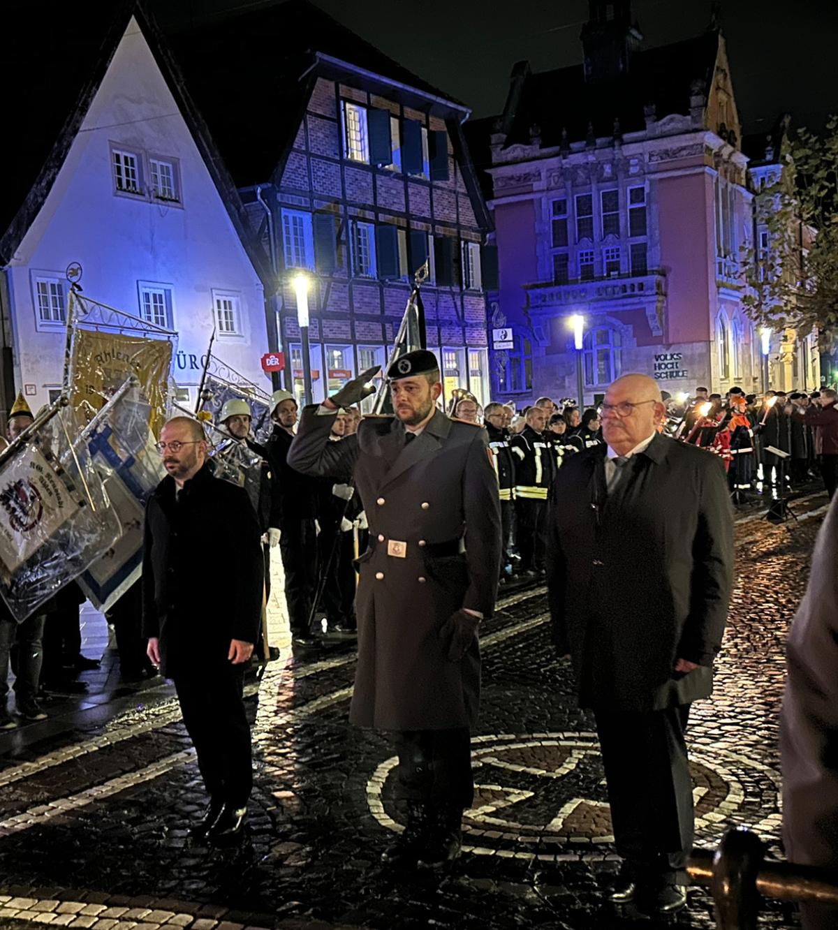 Mit Blick auf die Gegenwart betonte Harman die Solidarität mit der Ukraine und verwies auf den jüngsten Besuch des Bürgermeisters der befreundeten Stadt Khotyn, Andrii Dranchuk. Ein stilles „Slawa Ukrajini“ richtete er an die ukrainischen Freundinnen und Freunde. Zugleich dankte er dem Aufklärungsbataillon 7 für die Begleitung der Gedenkfeier und nannte die künftige Verleihung des Westfälischen Friedenspreises an die NATO ein Signal für Stabilität in unsicheren Zeiten.