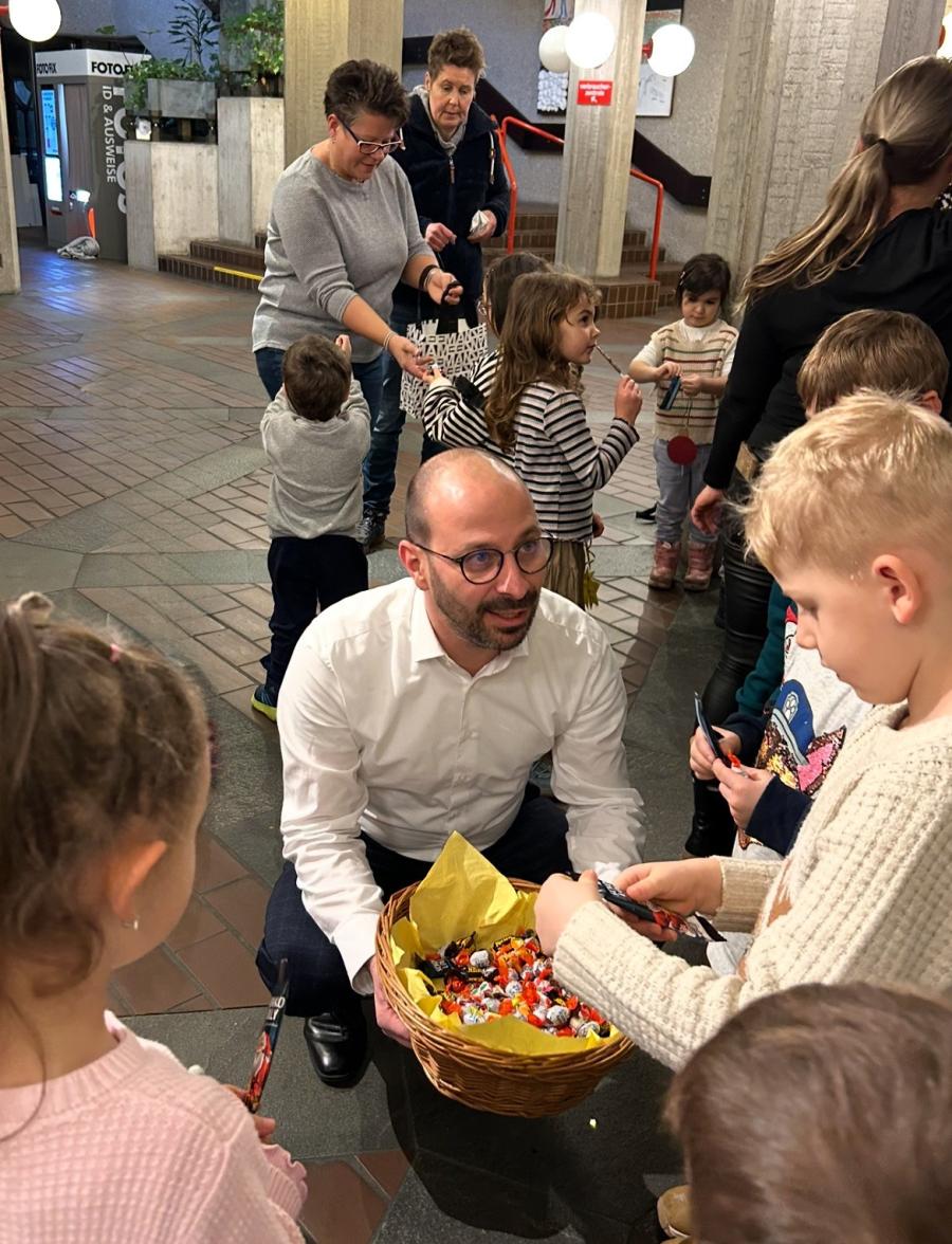Ein Hauch von Weihnachtszauber liegt über dem Rathaus: Gemeinsam mit Kindern der Kindertagesstätten Beumers Wiese, Milchzahn und Ostwall hat Bürgermeister Matthias Harman den großen Baum im Foyer festlich geschmückt. Mit viel Freude, Neugier und kleinen Händen voller Deko entstand nach und nach ein bunter, fröhlicher Weihnachtsbaum – geschmückt mit Kugeln, Sternen und selbstgebastelten Anhängern.