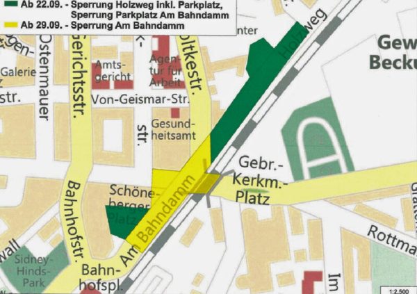 • Ab heute (22.09.): Holzweg + Parkplatz, Parkplatz „Am Bahndamm“