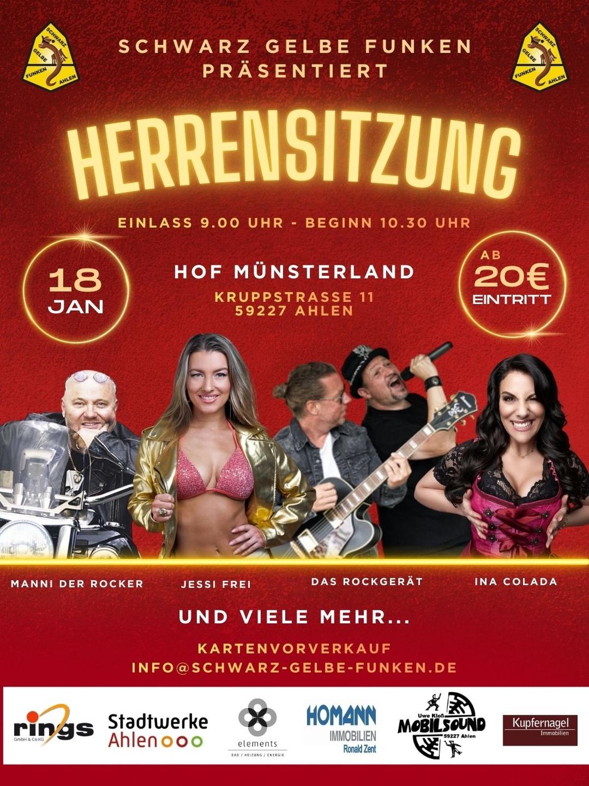 Ausgelassene Stimmung, Live-Musik, Showacts und karnevalistische Tradition sorgen für eine besondere Atmosphäre – laut, herzlich und respektvoll zugleich. Die Herrensitzung steht für Karneval, wie er in Ahlen gelebt wird: bodenständig, unterhaltsam und mit viel Leidenschaft.