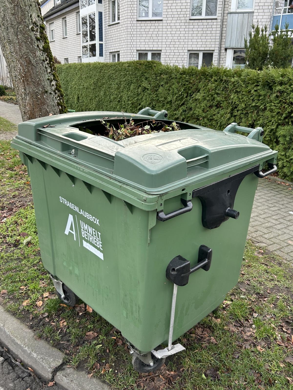 An einem Standort verschwand der Laubcontainer immer wieder, sodass er vor der Leerung erst gesucht werden musste. Um das künftig zu vermeiden, wurde der Container kurzerhand an einer Laterne gesichert. Der Standort bleibt bestehen – der Container nun ebenfalls. 😉