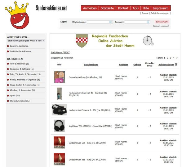 Online-Fundsachen­versteigerung der Stadt Hamm – Start Do., 13.11., 18:00 (Vorschau ab Do., 16.10.)