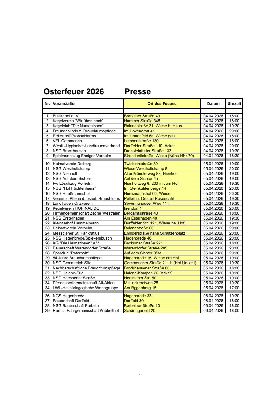Nachfolgend findest du die komplette Übersicht aller gemeldeten Brauchtumsfeuer in Ahlen.