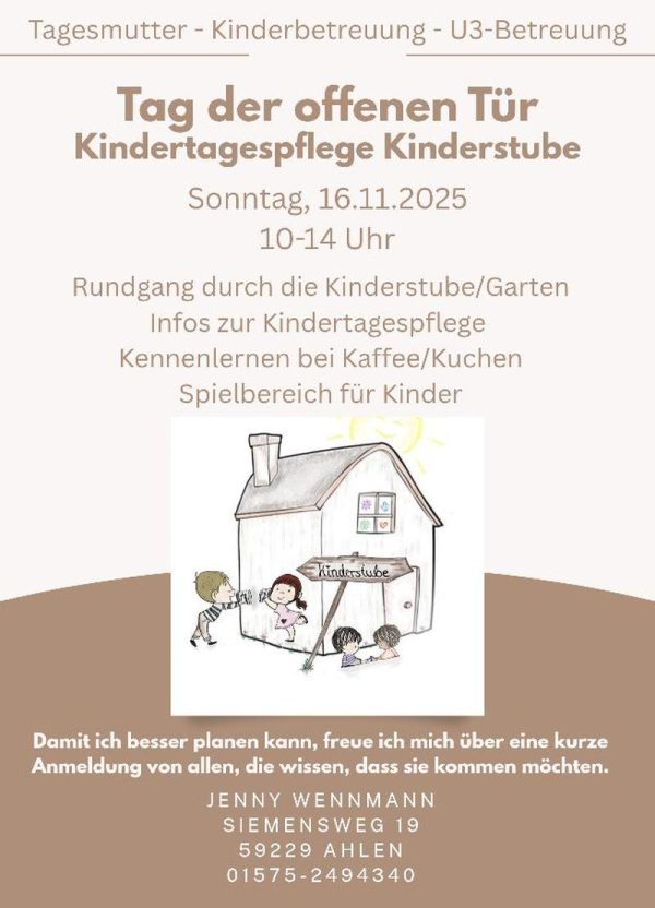 Die Kindertagespflege „Kinderstube“ öffnet am Sonntag, 16. November 2025, von 10:00 bis 14:00 Uhr die Türen. Vorbeischauen, reinschnuppern, Fragen stellen – ganz entspannt bei Kaffee & Kuchen.