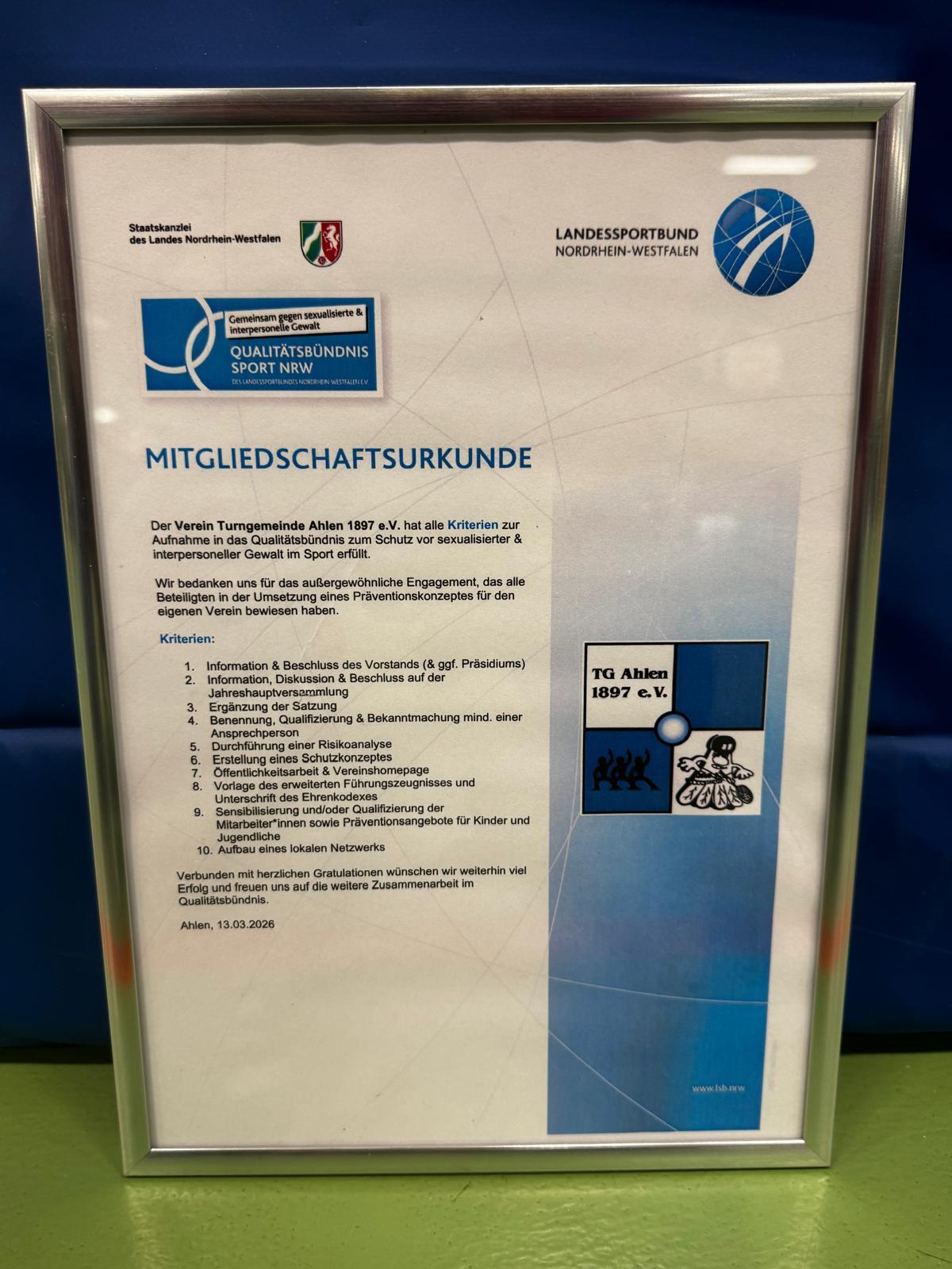 Die Turngemeinde Ahlen 1897 e.V. ist dem Qualitätsbündnis zum Schutz vor sexualisierter Gewalt im Sport des Landessportbundes Nordrhein-Westfalen beigetreten. Damit ist die TG Ahlen der erste Sportverein in Ahlen, der Teil dieses Bündnisses ist.